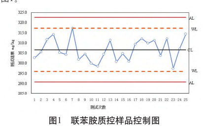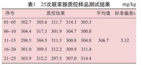本文選擇禁用偶氮染料中的高頻檢出物聯苯胺為質控對象,采用有證標準物質作為質控樣品,利用25次獨立的質控數據繪制控制圖,并進行分析和應用。試驗結果表明,所測結果均在上、下警告限之內,證明檢測過程處丁受控狀態,檢測結果可靠有效。
