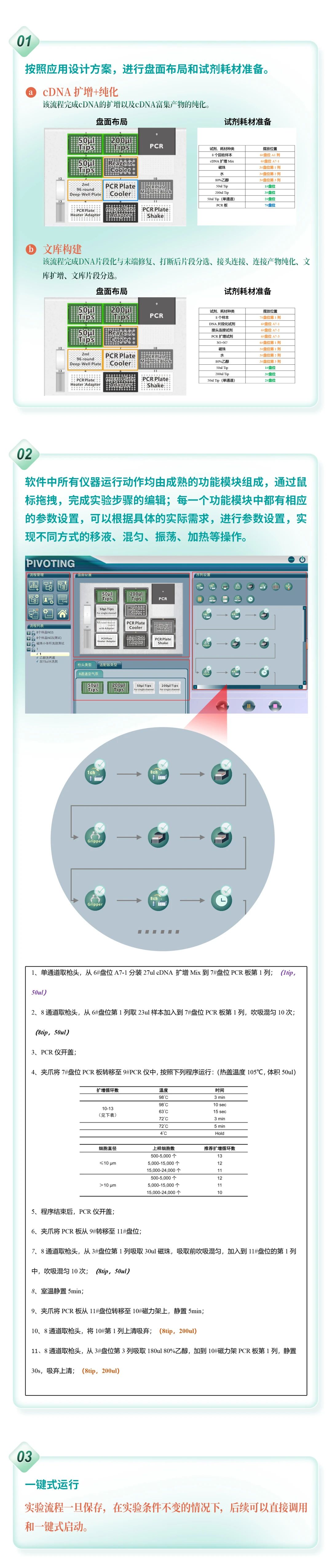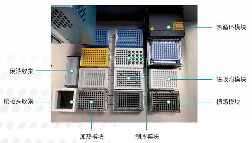 包含建庫所需要的所有功能模塊(PCR板冷槽、PCR 板加熱模塊、PCR 板振蕩模塊、PCR板磁力架、PCR儀),滿足不同建庫流程的需要;