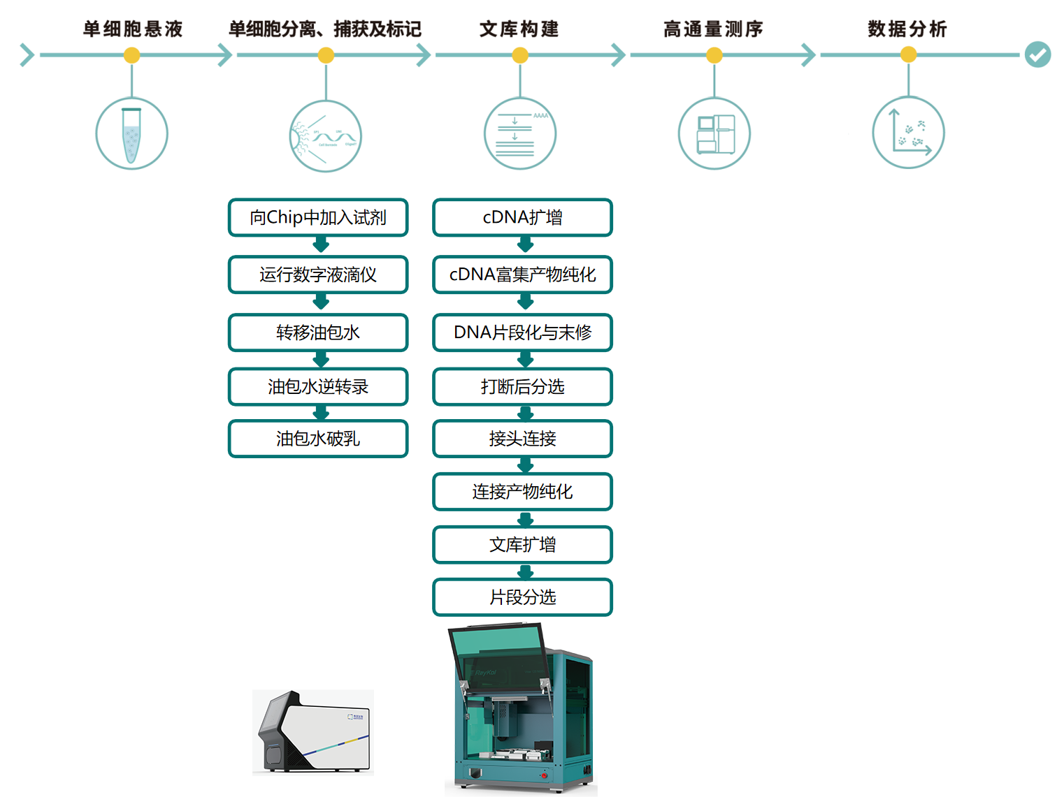 以下流程以尋因生物為代表的微流控數字液滴+Barcoded Beads技術的高通量單細胞轉錄組建庫試劑盒流程,結合睿科Vitae 120 NGS-SA建庫儀,實現8個樣本的高效細胞轉錄組的測序文庫構建。