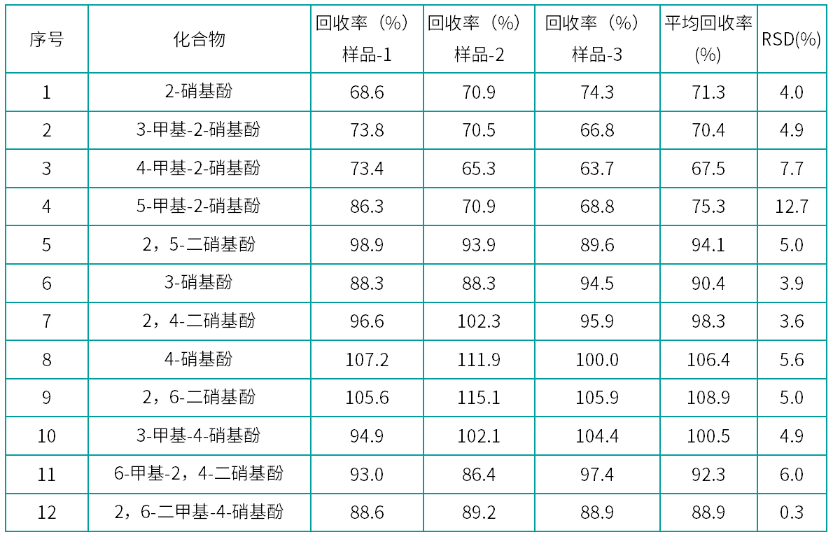 為了驗(yàn)證該方法的回收率,本實(shí)驗(yàn)向純水樣品(1000 mL)加入10μg硝基酚類化合物混標(biāo)進(jìn)行加標(biāo)回收驗(yàn)證(n=3),數(shù)據(jù)如表-3所示。加標(biāo)回收率在67.5%-108.9%之間,RSD值控制在15%以內(nèi)。說(shuō)明該方案能夠很好地運(yùn)用于水中硝基酚類化合物的檢測(cè)。